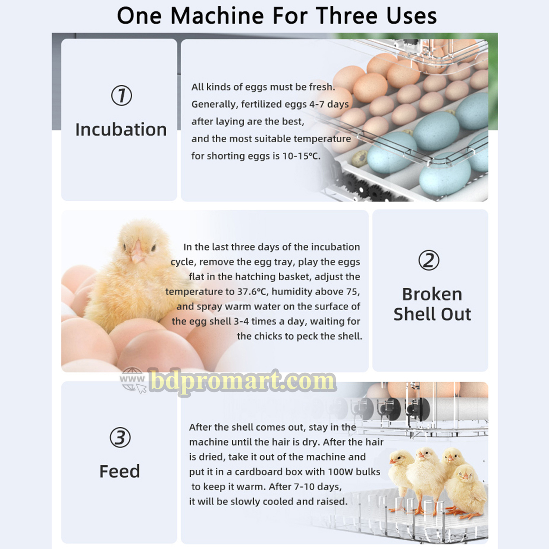 - ব্যবহারঃ হাঁস-মুরগী, কবুতর, কোয়েল, টার্কি, তিতির, পাখির ডিম ফুটিয়ে বাচ্চা তৈরীর ইনকিউবেটর মেশিন