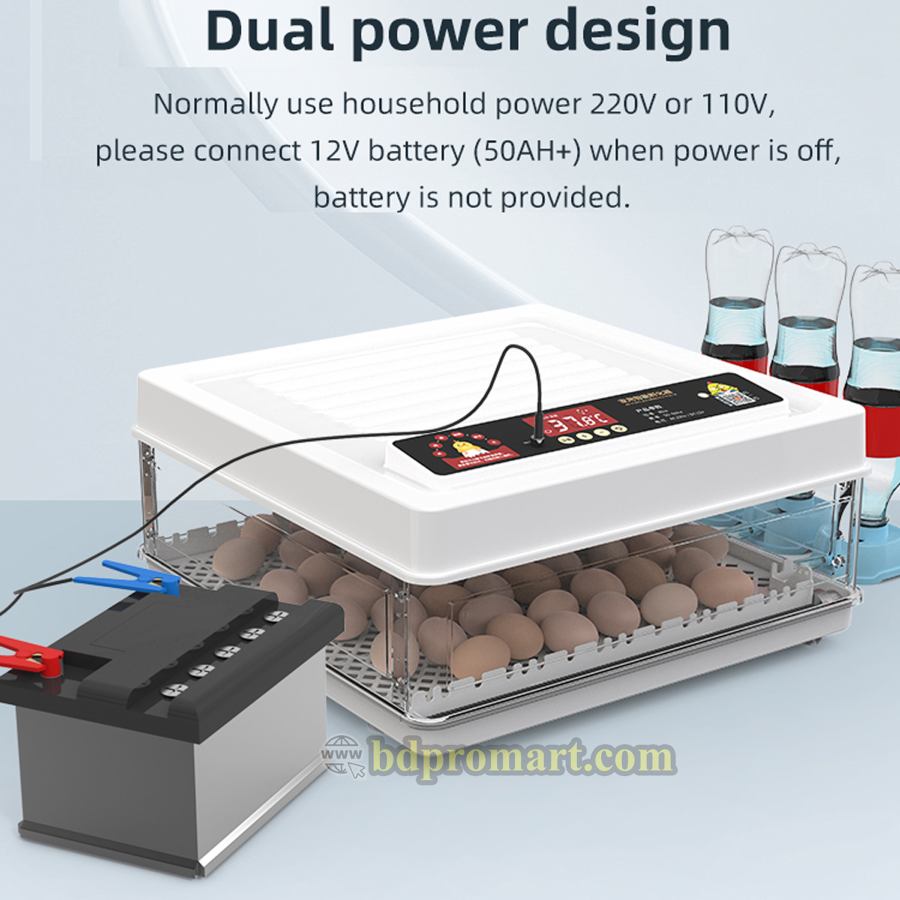 - ইনকিউবেটরটিতে তাপমাত্রা ও টার্নিং সিস্টেম অটোমেটিক। আদ্রতা নিয়ন্ত্রনের জন্য প্রয়োজন অনুযায়ী ম্যানুয়ালী পানি ব্যবহার করতে হবে।